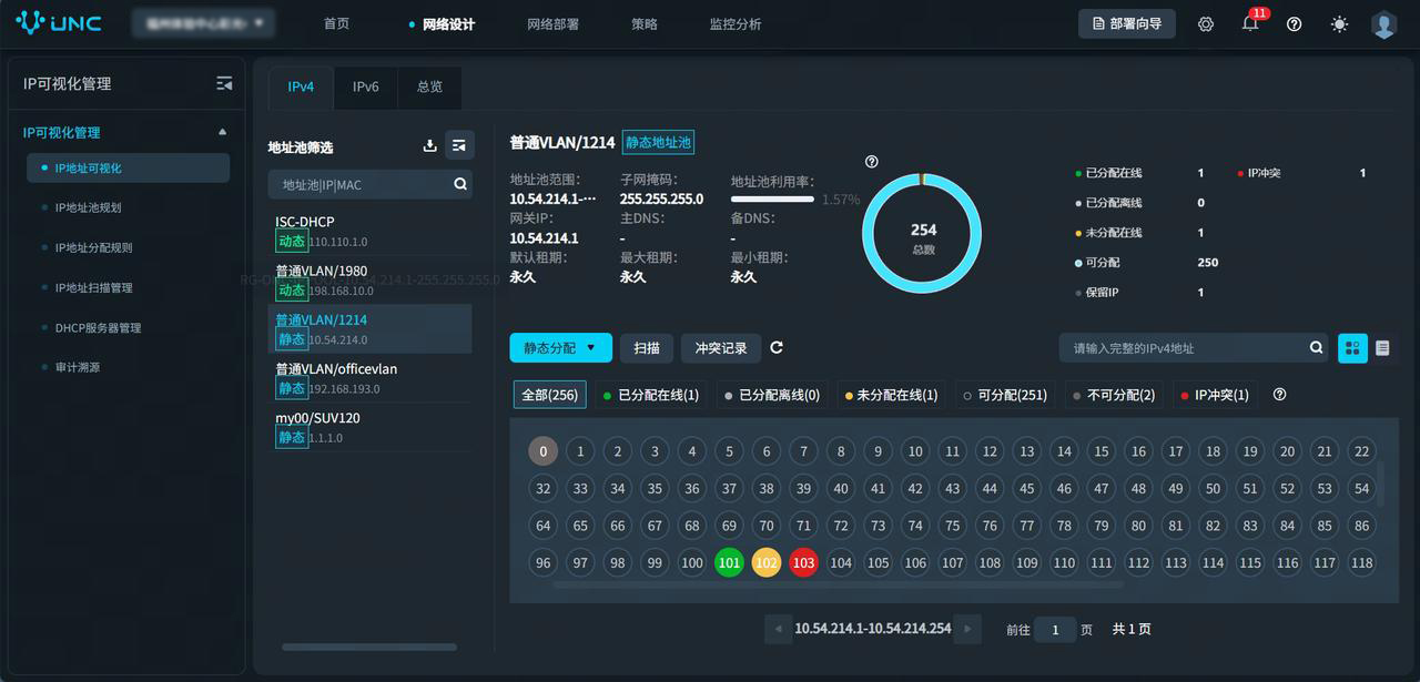 现在通过全局IPv4/IPv6可视化管理,支持IP在线、离线、已分配、冲突等状态信息可视,针对利用率异常及IP冲突自动告警。