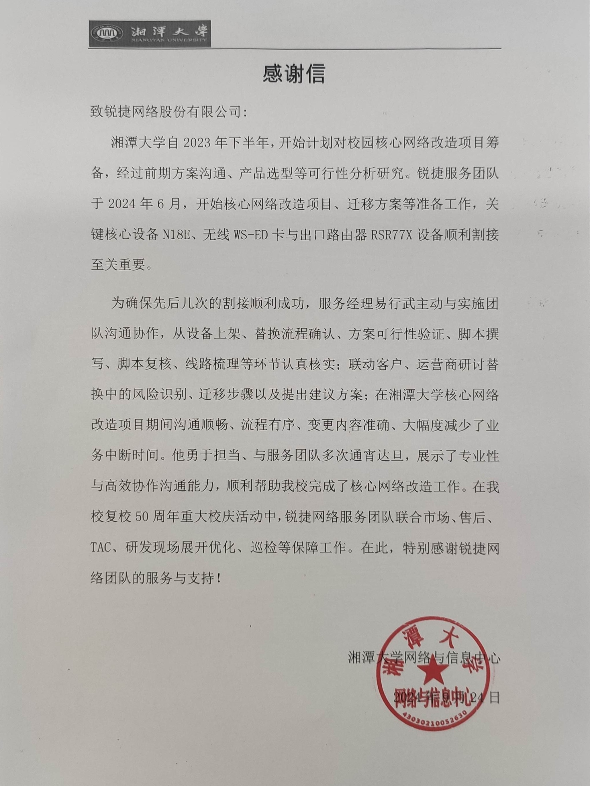 锐捷网络以卓越的产品品质和专业的服务保障,与湘潭大学建立了长达八年的深度合作伙伴关系。自2016年合作至今,湘潭大学的核心交换、出口路由、认证计费、数据中心、无线网络及云桌面等关键网络设施均采用锐捷解决方案,构建了完整的校园网络体系。这份持续的合作信任,既源于客户对锐捷产品性能的高度认可,也得益于我们服务团队专业高效的运维保障。未来,锐捷将继续践行"以客户为中心"的服务理念,以更优质的产品和服务回馈客户的长期信赖。