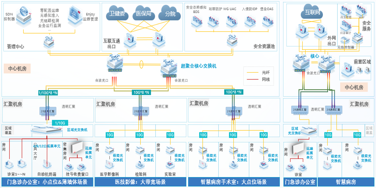 满足“智慧管理”功能定位需求,满足“公立医院运营管理信息化功能指引”要求,为运营管理、后勤保障提供互联网和物联网服务。利用极简以太彩光的高带宽和易运维特性,把包括高清视频监控、办公网、IPTV网络、IP电话通信网络、物联网等五张传统物理网络整合为一张物理网络,各业务逻辑隔离。