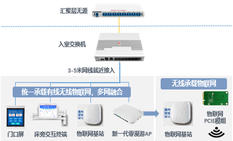 智慧病房光纤入室,部署干净简洁,扩展灵活,新增业务快速上线。医院每个病房都部署彩光POE交换机,有线门口屏、床旁交互终端、监护仪等业务终端采用POE方式接入到彩光交换机。减少水平布线,病房内走线部署更简单、更安全、更美观,新增设备和业务可以快速上线。