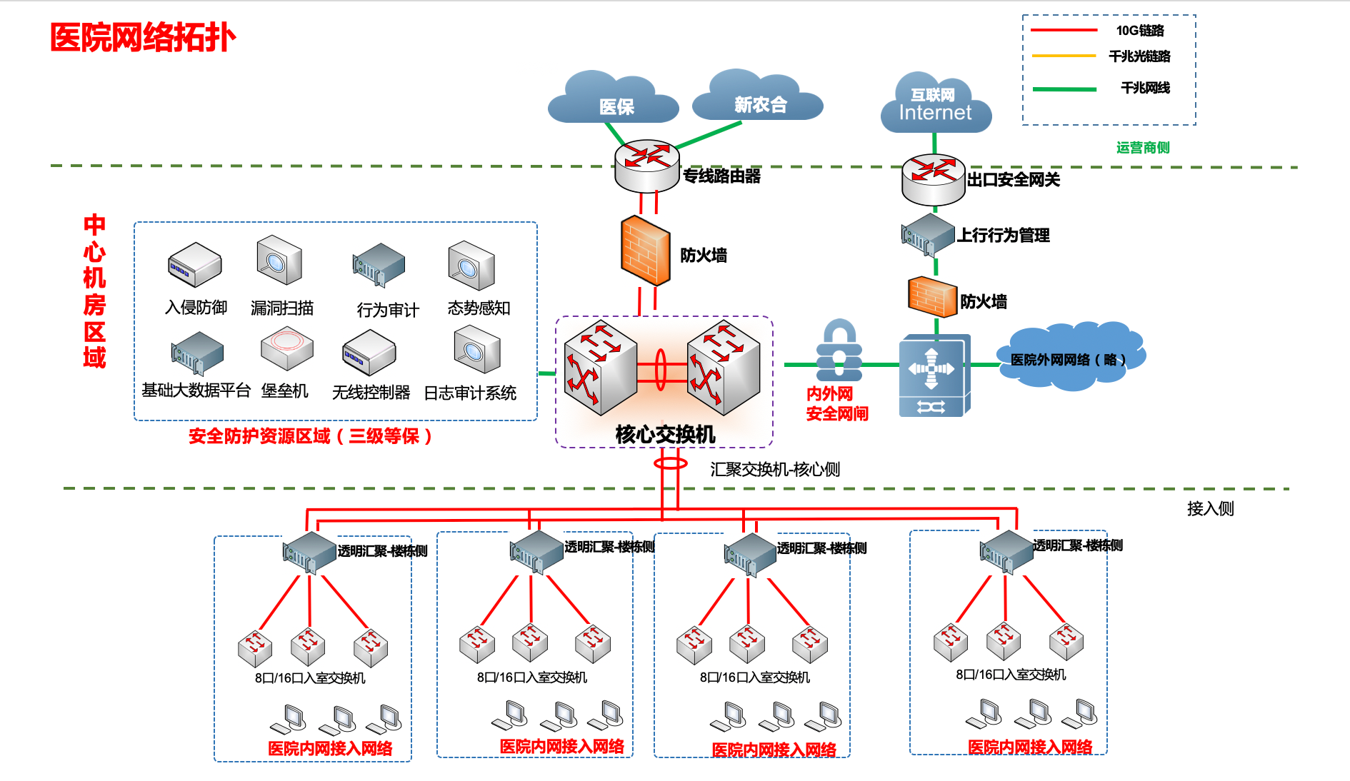 经过多方调研与技术论证,我们最终选择了一条“光”的革新路径——光纤到房间的全光网架构。本次改造方案,我们通过大二层光网络架构实现扁平化组网。打破了传统网络的多层转发瓶颈,将光纤直接延伸至病房终端,构建“核心直连、极简接入”的高效架构。
