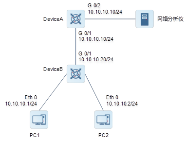 如图1-8中所示。网管希望通过网络分析仪对DeviceA和DeviceC的流量进行监控。其中对于DeviceA,监控双向数据流;对于DeviceC,仅监控部分发送到Device的报文。为了合理利用资源,对监控报文进行采样,采样率为1000。