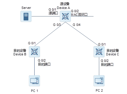 l 配置DeviceA为源设备,配置远程镜像VLAN,配置端口GigabitEthernet 0/1为源端口,与目的设备相连的端口GigabitEthernet 0/3和GigabitEthernet 0/4为输出端口,配置GigabitEthernet 0/2接口为MAC回环口,用于实现一对多镜像的“反射”功能。配置输出端口可交换功能。
