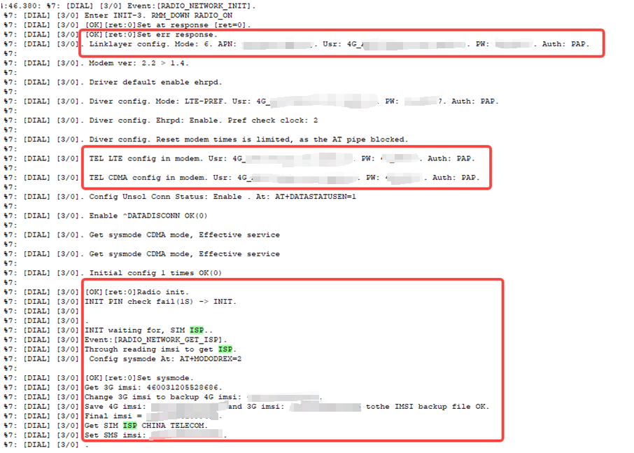 打开dial流程的debug,观察dial debug发现在拨号的过程中,相关的authtype和apn都配置成功,但是并没有开关射频的AT发送成功的记录。如下图所示。