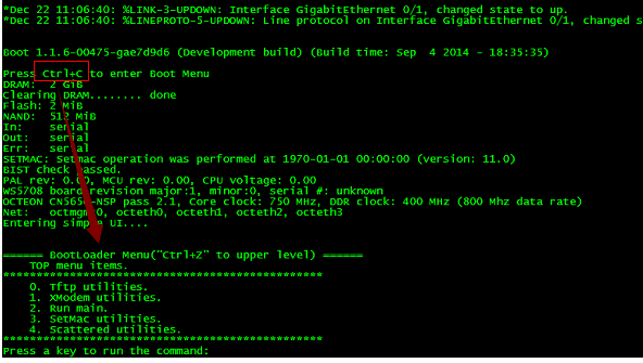 ② 重启无线设备(设备重新下电上电),设备上电后立刻连续快速的按键盘 Ctrl 和 C 键进入 ROM 层