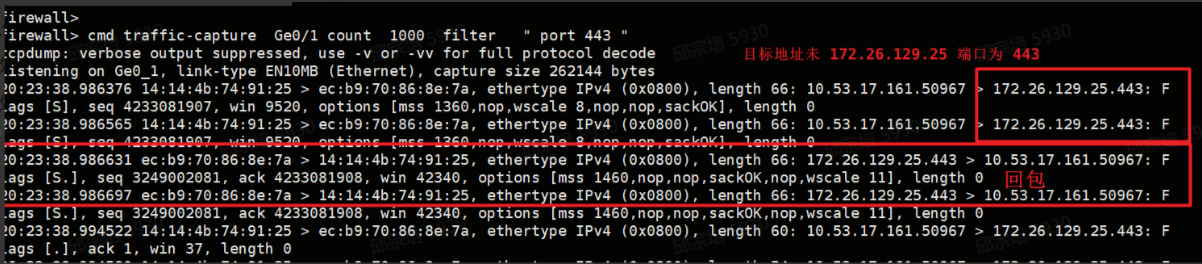 Ge0/0表示接口名称,1000表示抓取数据包数量," port 443 " 表示抓取端口为 443。