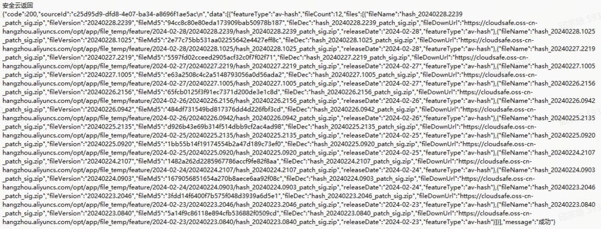 从设备端下发的日志过来分析,应该是安全云端返回的包存在异常导致,目前设备的版本是20240222.0813安全云一共返回了12个增量包,但是里面没有与设备版本相匹配的增量包。