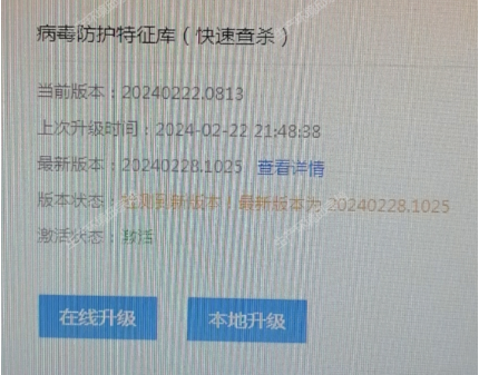 设备目前版本为NGFW_NTOS1.0 R7,目前病毒防护特征库(快速查杀)版本为20240222.0813升级到20240228.1025版本,升级方式为在线升级。