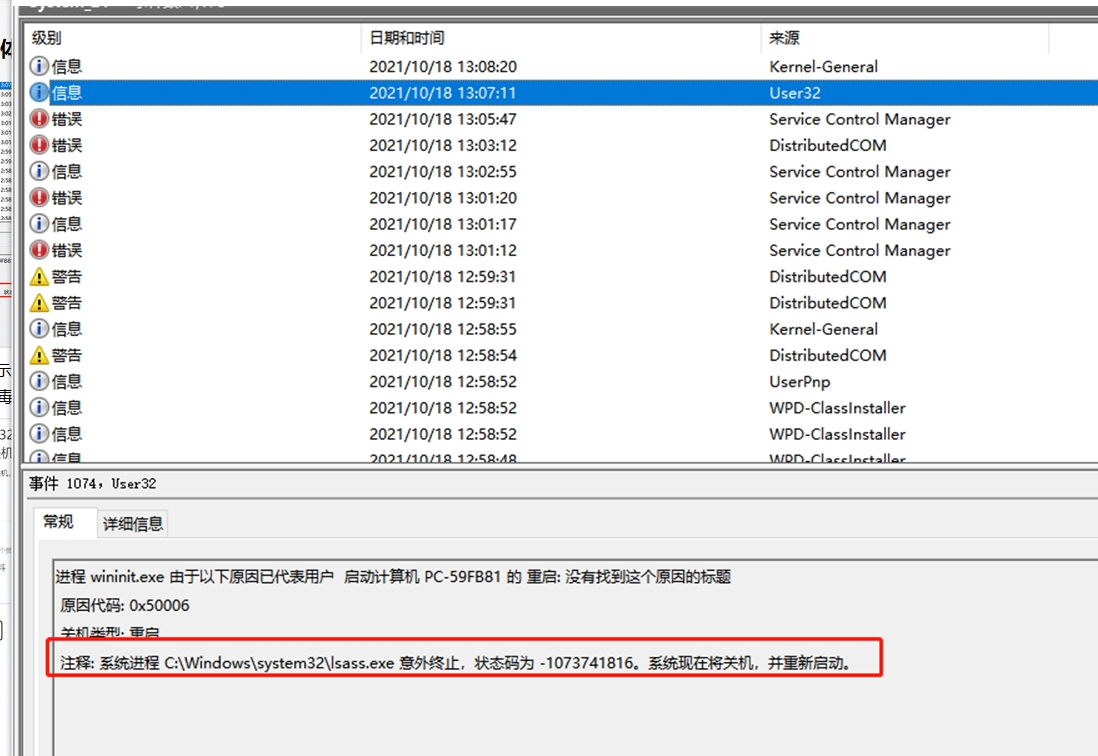 3、收集云桌面日志,分析windwos日志发现有lsass.exe奔溃的导致提示重启。