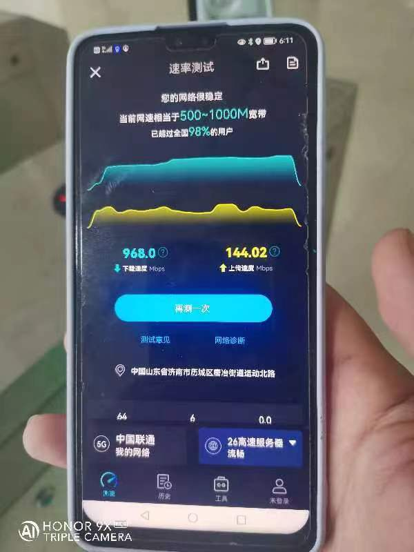 5G部分,集中部署30套框式大容量BBU,192台融合型pHUB与1100个融合型5G pRRU,无线覆盖全校宿舍、教学楼、食堂等区域,实测下载速率超900Mbps,告别“信号差、上网慢”。
