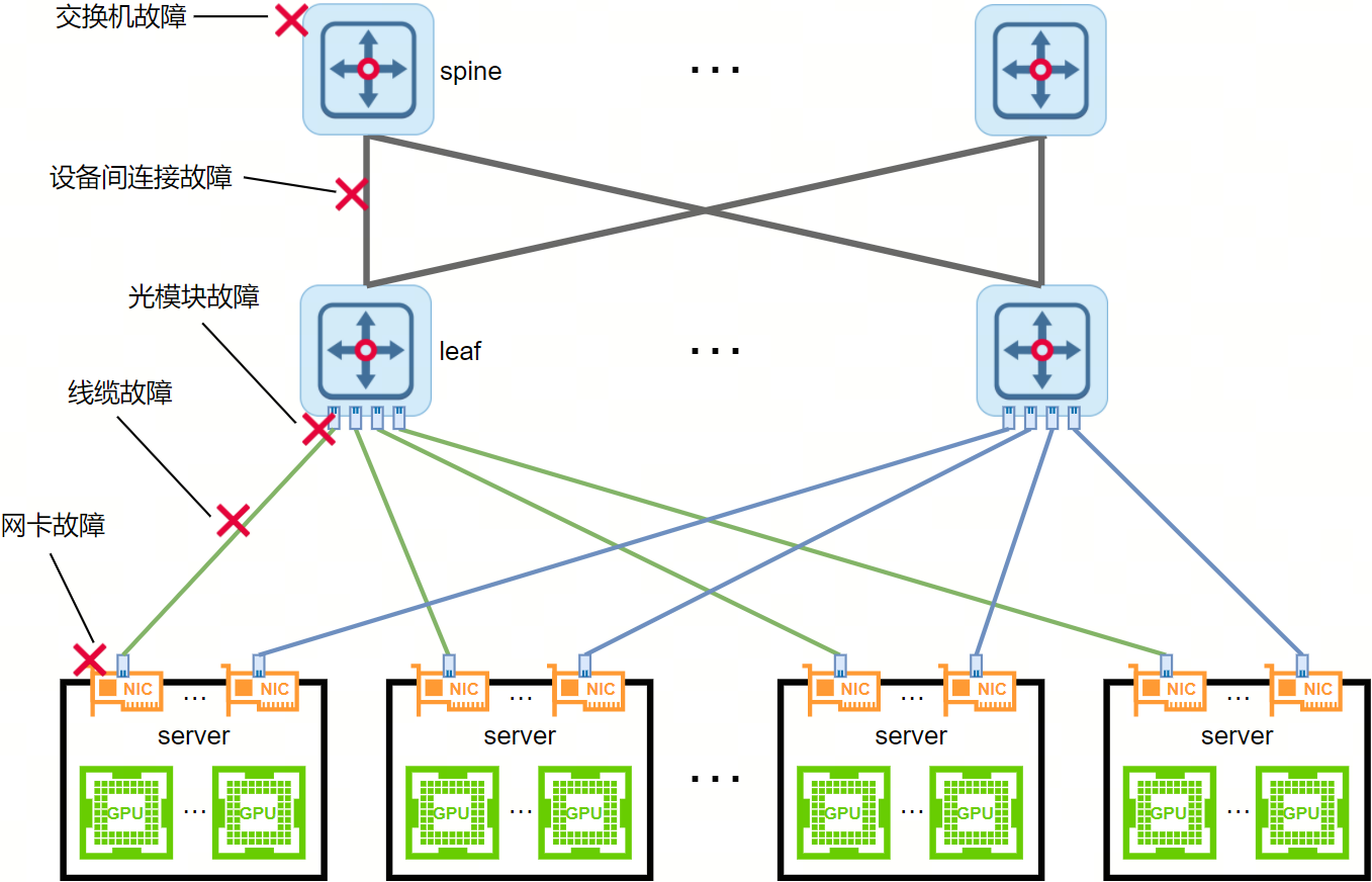 交换机设备间链路故障目前已能够实现毫秒级处理与收敛,但端侧网络设备故障目前尚无较为高效的处理方案。端侧设备故障主要包括服务器网卡故障、服务器与交换机的连接线缆损坏以及线缆光模块故障等。随着计算集群规模持续扩大,端侧网络设备故障已成为亟待解决的问题。