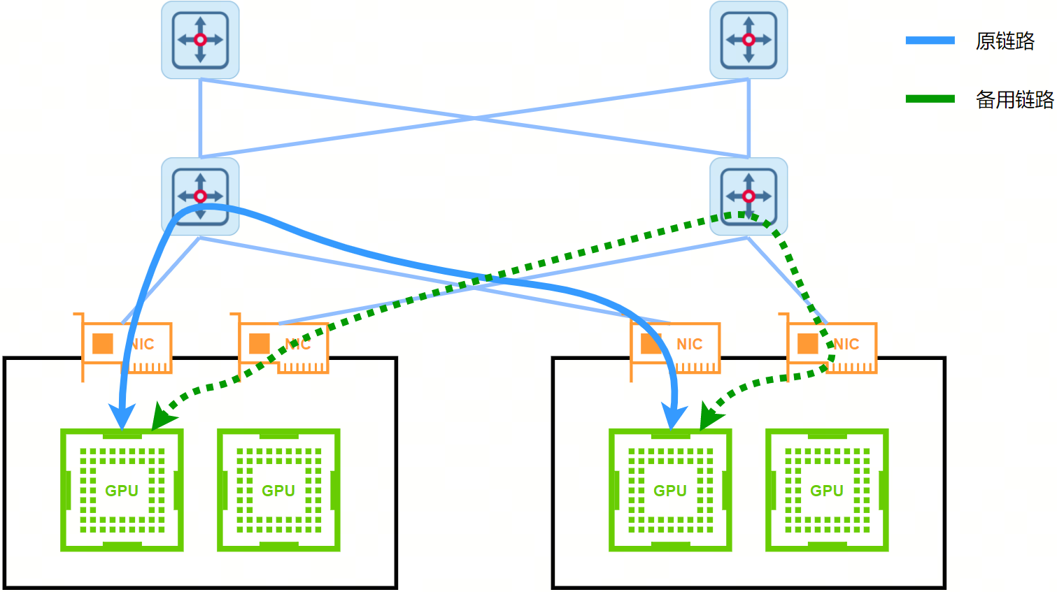 锐捷网络的端侧链路故障逃生是一种基于NCCL(NVIDIA Collective Communications Library)实现的端侧链路故障快速规避方案,能够在上层训练框架无感知的情况下,自动对端侧链路故障进行识别并处理,在模型训练过程中发生端侧链路故障时能够保持训练不中断,在故障设备完成修复后训练性能自动恢复。
