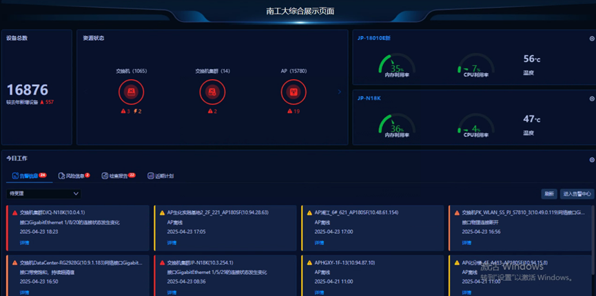 资源告警概览监控视图实时统计16800+IT设备的健康状态,动态显示关键设备的CPU/内存利用率及温度指标,告警列表自动聚合设备离线、接口饱和、光链路异常等事件,并按严重程度分级推送。结合IT资源连续性保障图的健康度分析模型,信息管理中心可提前了解到设备的网络健康情况,真正将网络管理从 “被动响应” 转变为 “主动预防”。