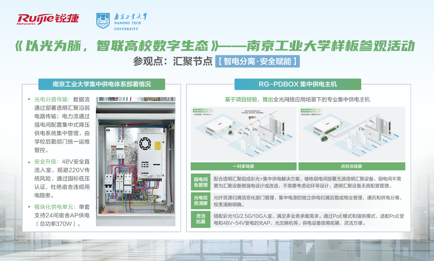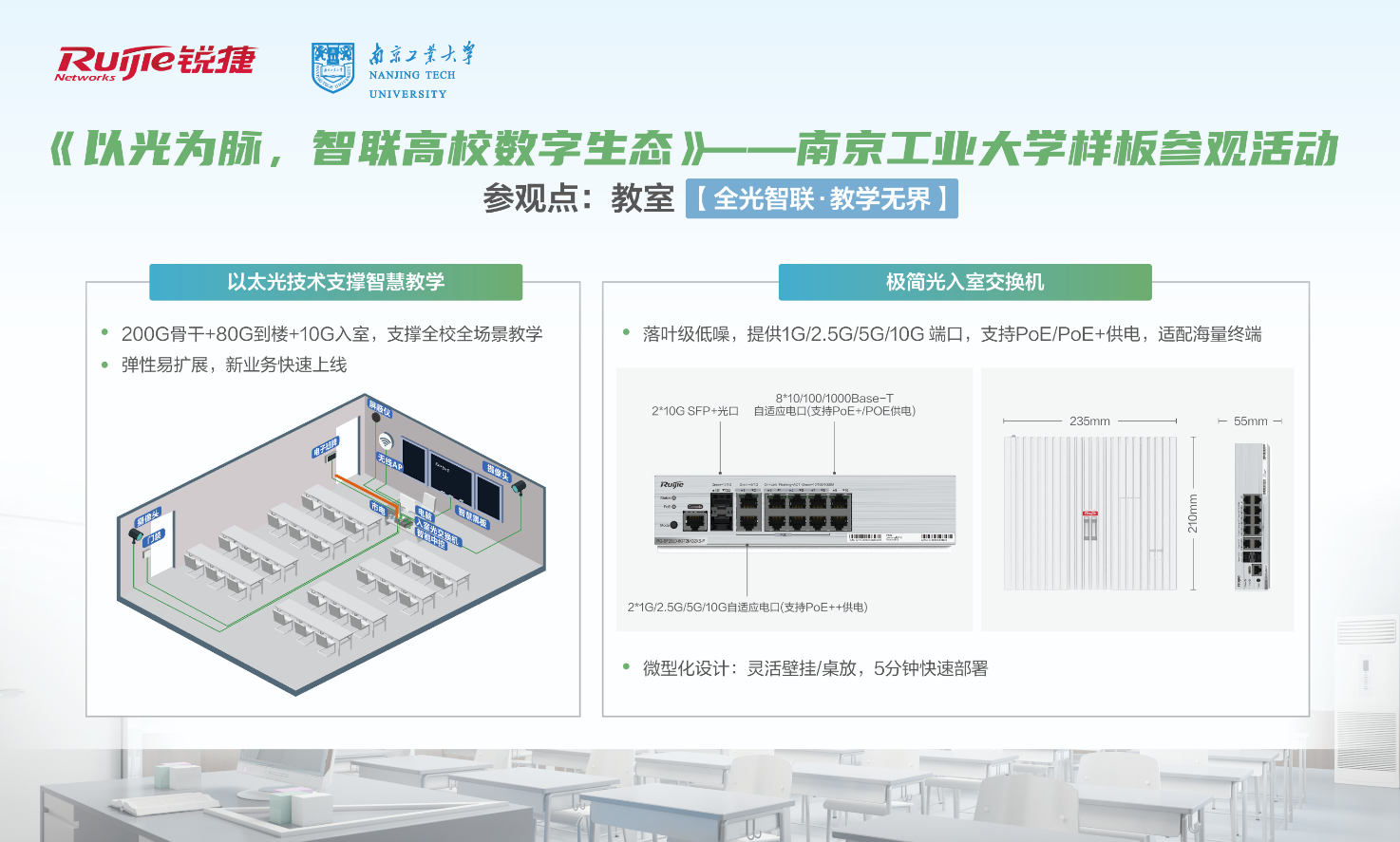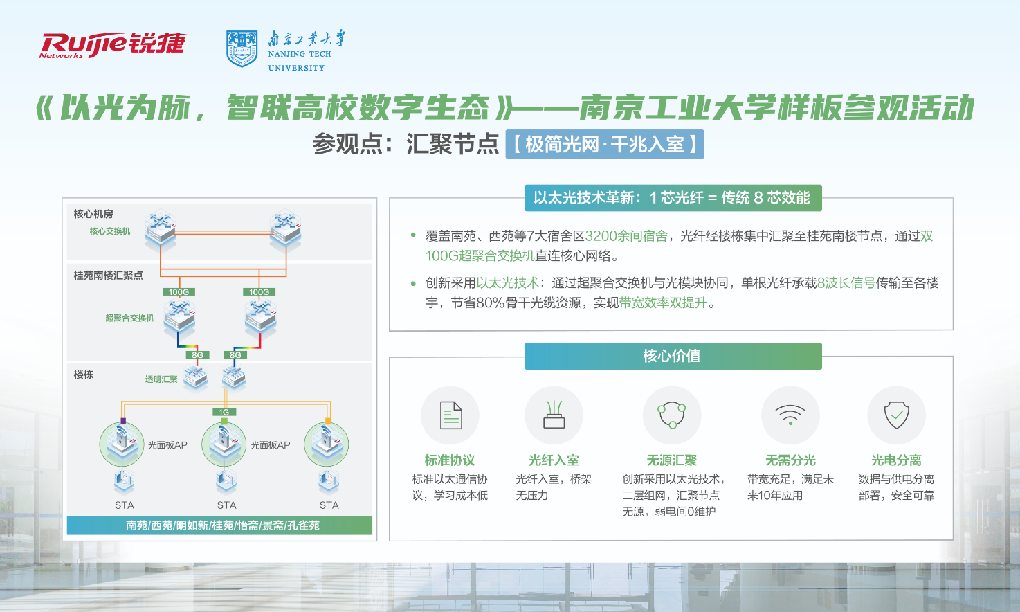 4月18日-19日,南京工业大学联合锐捷网络举办“以光为脉,智联高校数字生态”样板参观活动。活动吸引了江苏省内100余所高校的信息化负责人及行业专家参与,通过场景化展示与深度技术研讨,全面呈现了以太彩光技术在高校网络建设中的创新突破与落地价值。