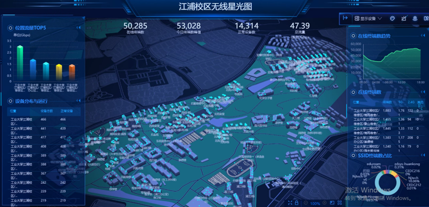通过无线星光图,学校运维人员可直观查看全校15000+无线 AP 的实时布局,精准定位每个AP的归属位置、运行状态及终端密度,实时监控接入用户数量及历史峰值,实现从 “设备管理” 到 “体验管理” 的升级。