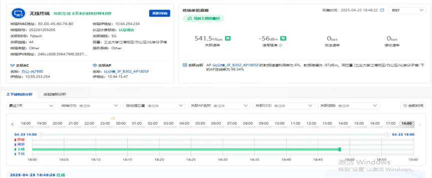 感知图提供有线/无线终端统一管理能力,支持通过入网账号秒级定位终端IP、MAC 地址及实时位置,深度分析上下线异常、漫游质量、频段占用等6大无线体验指标,实现历史接入轨迹全追溯。例如,当某终端出现信号波动时,平台可快速回溯72小时内的漫游路径与信号强度变化,精准识别故障AP或链路问题,将传统人工排查耗时从小时级压缩至分钟级。