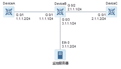 如图1-8中所示。网管希望通过网络分析仪对DeviceA和DeviceC的流量进行监控。其中对于DeviceA,监控双向数据流;对于DeviceC,仅监控部分发送到Device的报文。为了合理利用资源,对监控报文进行采样,采样率为1000。