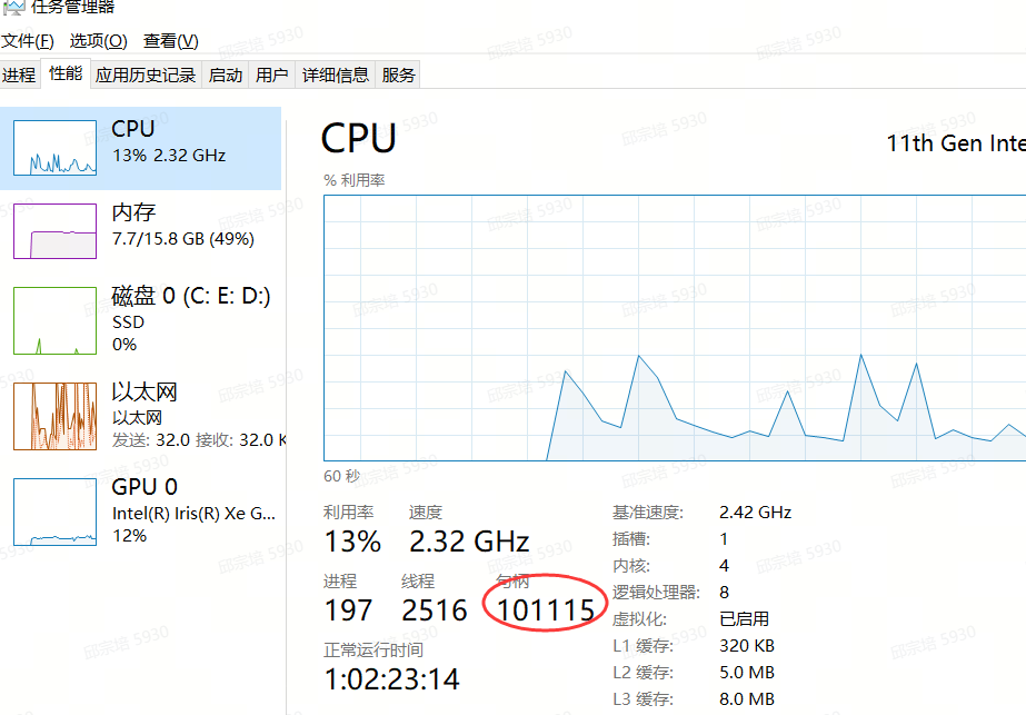 4、检查云桌面windows系统任务管理器cpu内存资源使用率是否异常,系统句柄数是否过大。