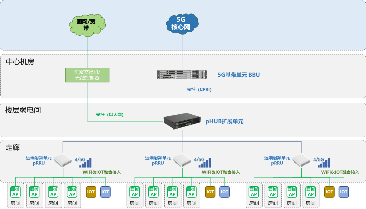 弱电间仅部署2-3台融合型pHUB即可满足整栋楼固移双网覆盖需求